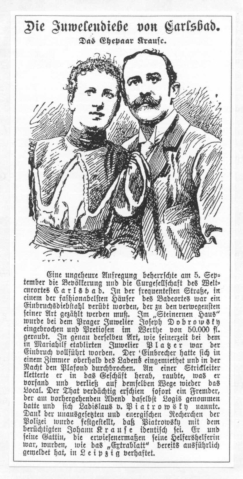 Zum Abschluß noch ein Wort zur Seite 2: Den kurzen Bericht über "Die Juwelendiebe von Carlsbad" [Illustrierte Wiener Zeitung vom 15.September 1897] entnahmen wir einem Buch über die k.u.k. Heilbäder von Alfred Niel. Leider konnten wir bisher nicht feststellen, ob das genannte Ehepaar in irgendeinem Zusammenhang mit der Linie 08 steht.